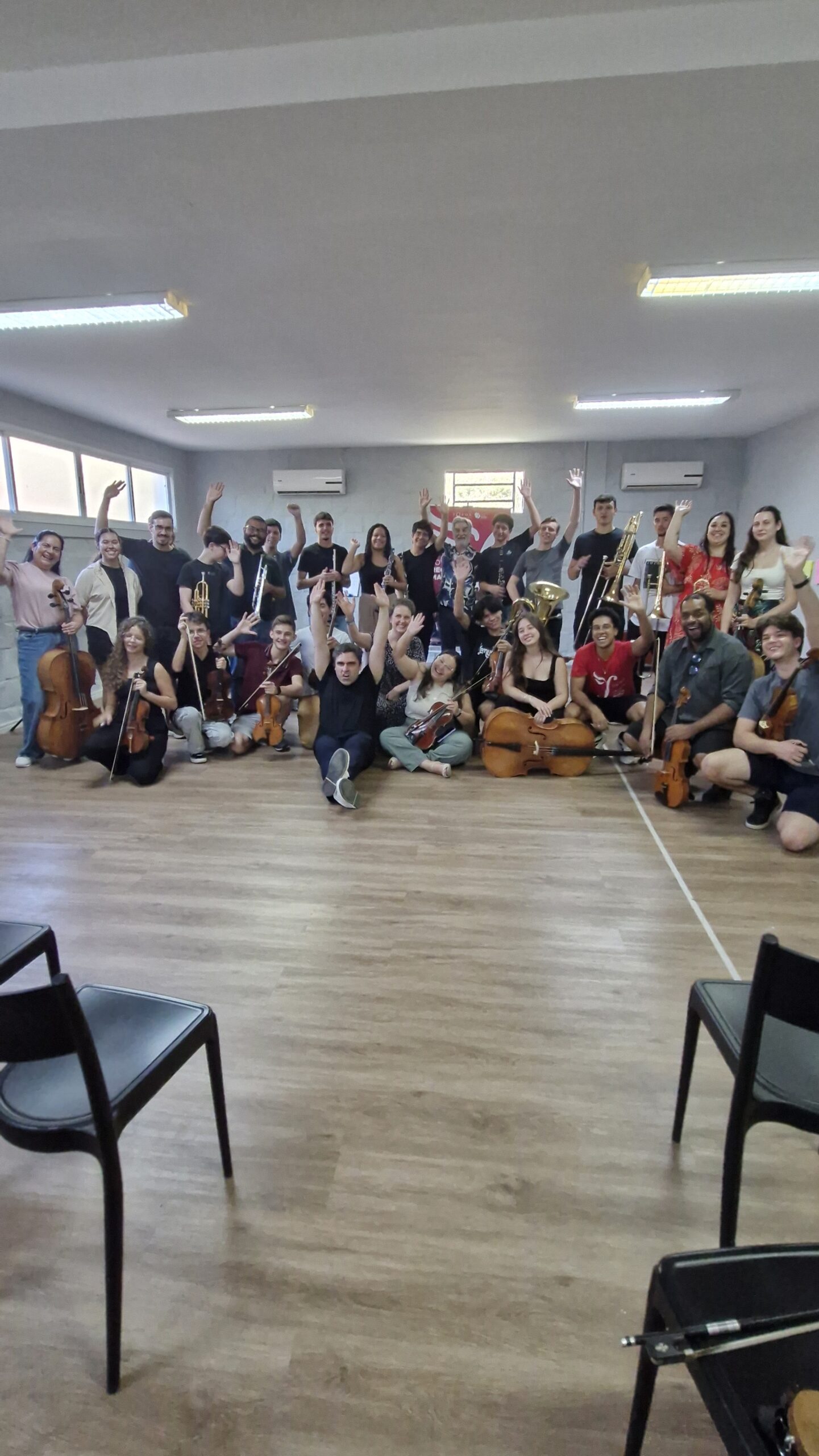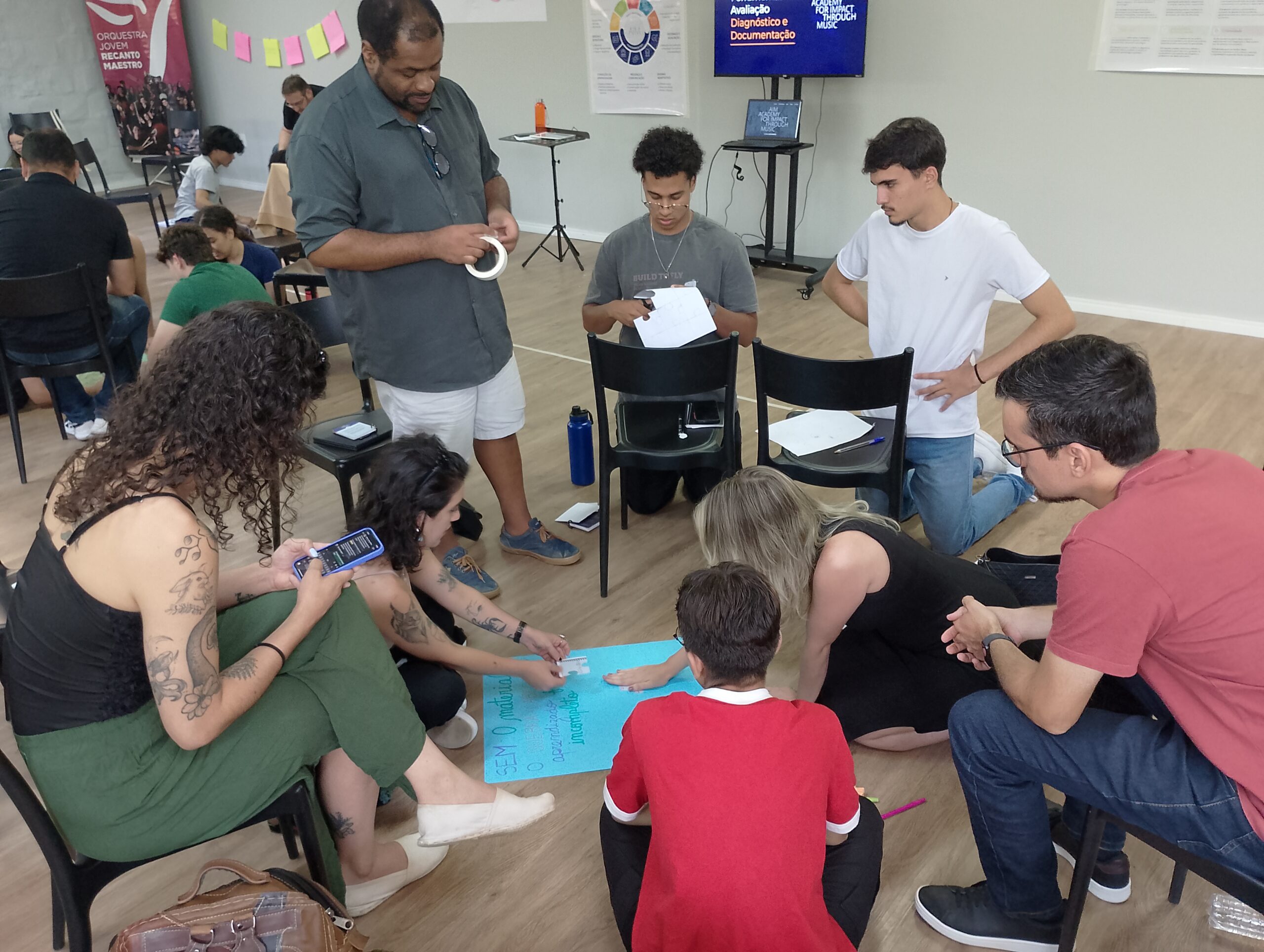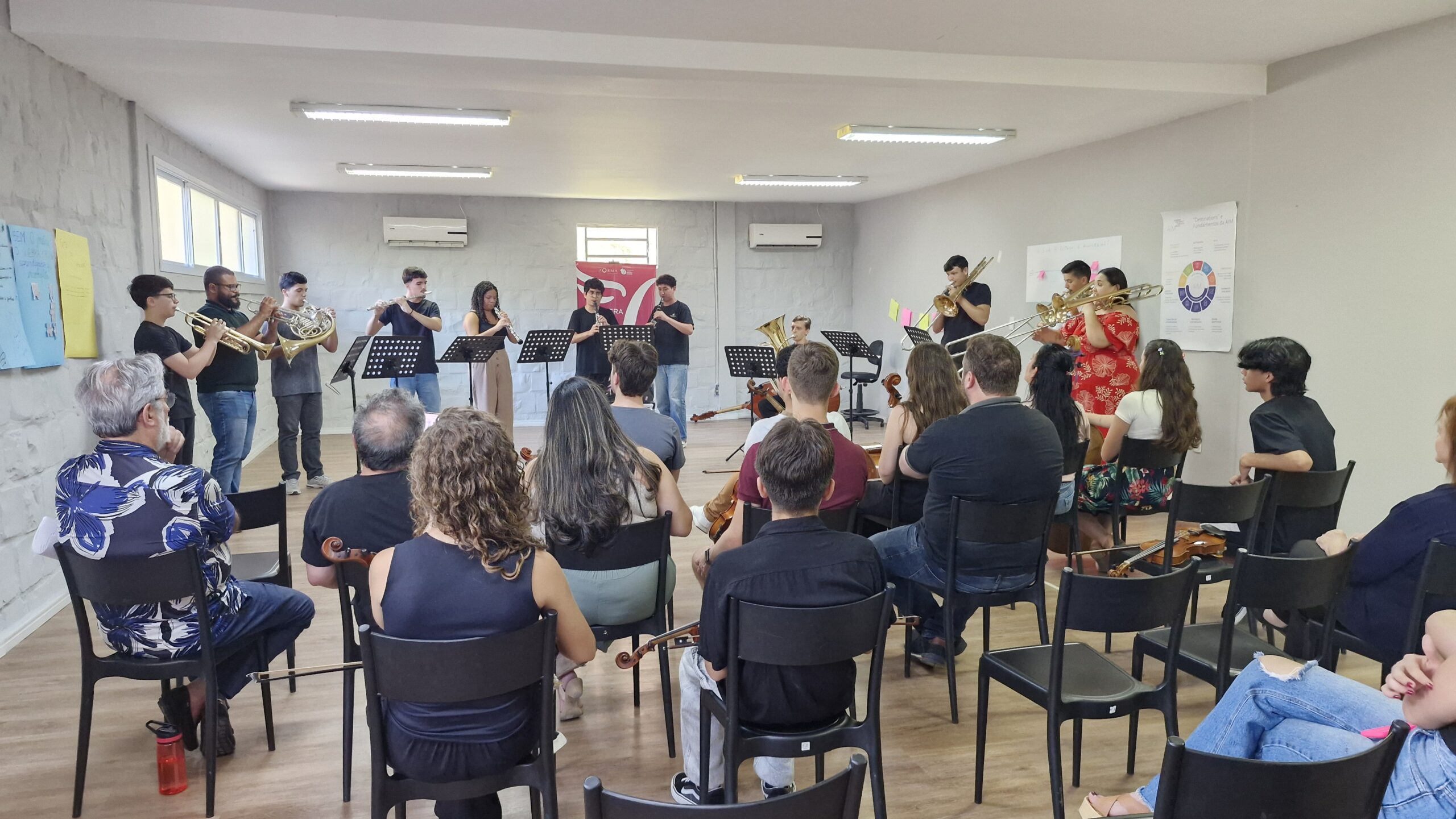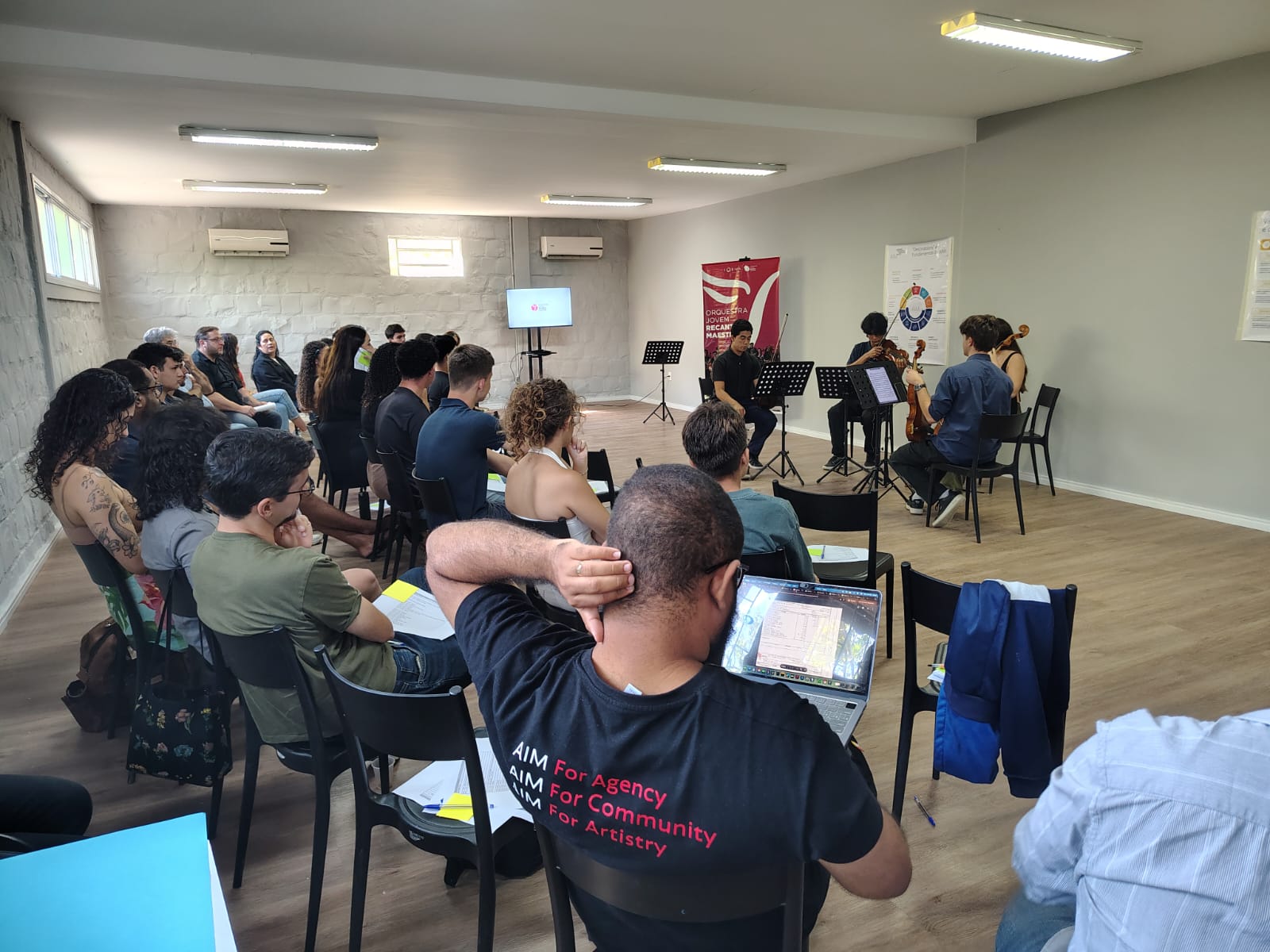Realizada na sede da Orquestra, a semana contou com a parceria da Academy for Impact Through Music (AIM), instituição internacional que apoia projetos de educação musical com impacto social. A programação incluiu atividades formativas, ensaios, aulas, construção de planos de ação e momentos de alinhamento pedagógico, além da participação de convidados como José Henrique de Campos (NEOJIBA), Raphael Elias (NEOJIBA) e da professora Hella Frank (UFRGS), referência na formação de cordas.