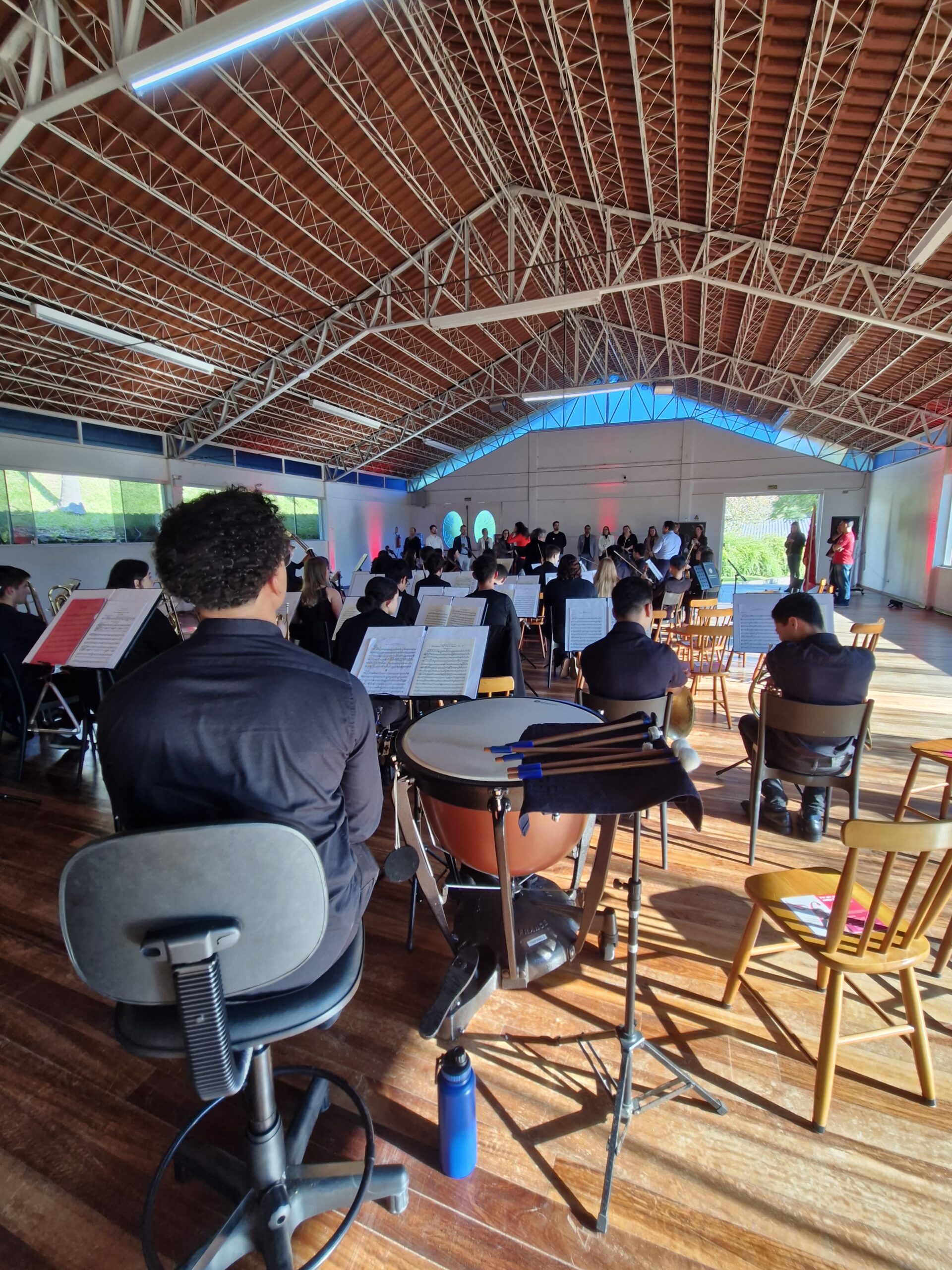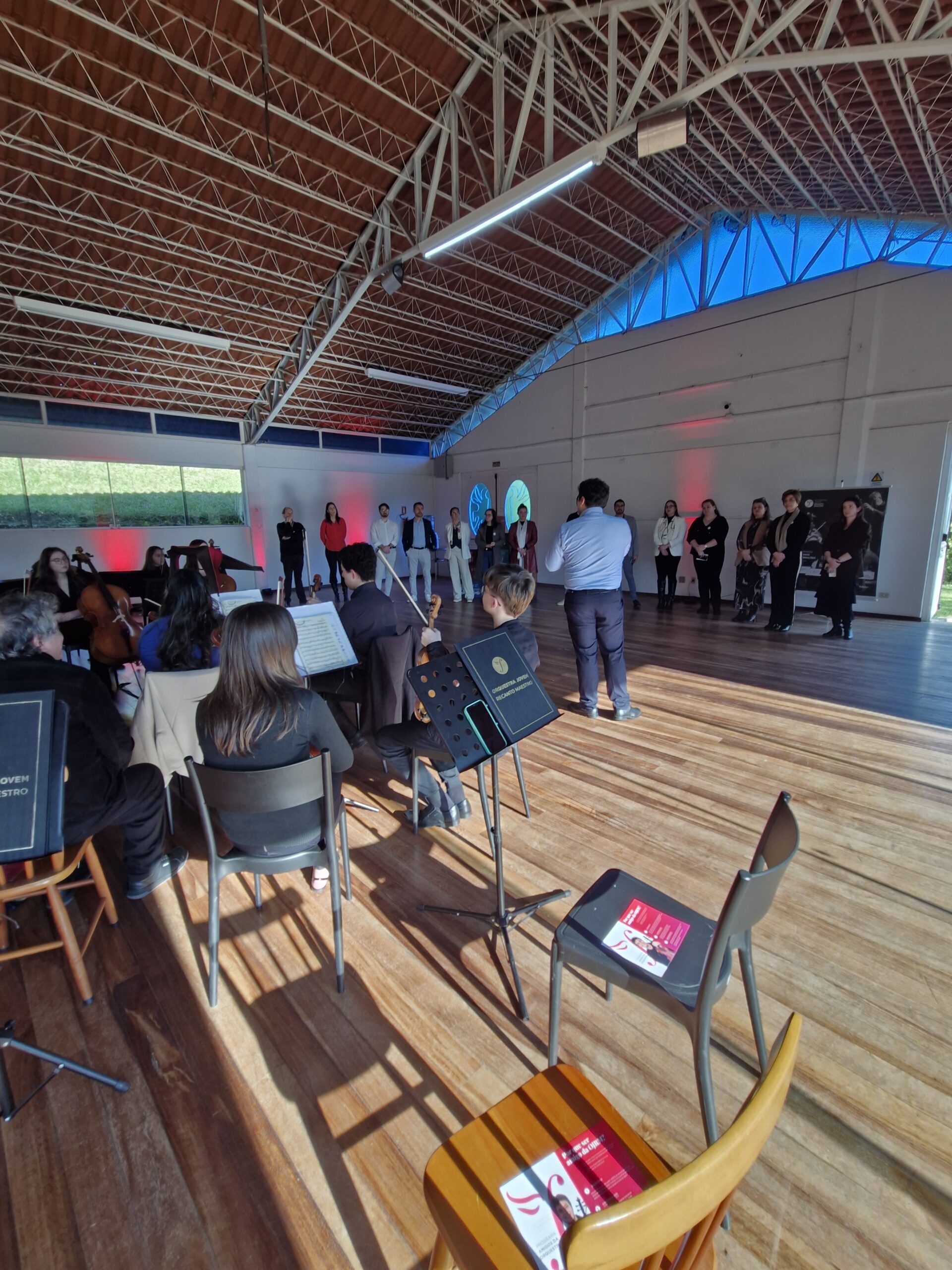 Recebidos na sede da OJRM, os professores foram surpreendidos com uma apresentação inusitada. Eles tiveram a oportunidade de se sentar junto aos músicos da orquestra, vivenciando de perto o som e a vibração dos instrumentos. Essa imersão permitiu que sentissem na pele a emoção de produzir música ao vivo e compreender melhor a experiência de quem se apresenta para um público.